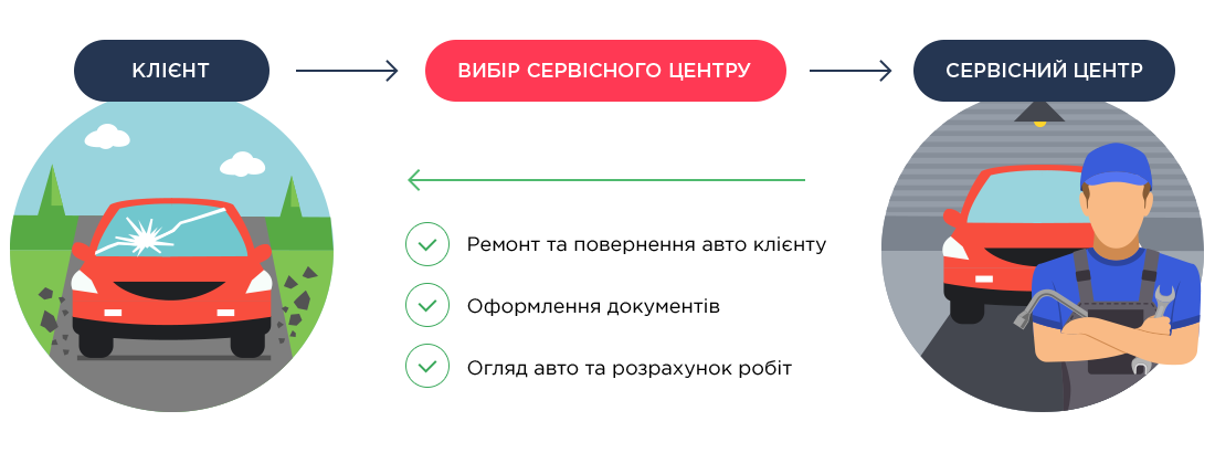 - Оформлення всіх необхідних документів по страховій події та заяви відбувається на зручній для Вас СТО;