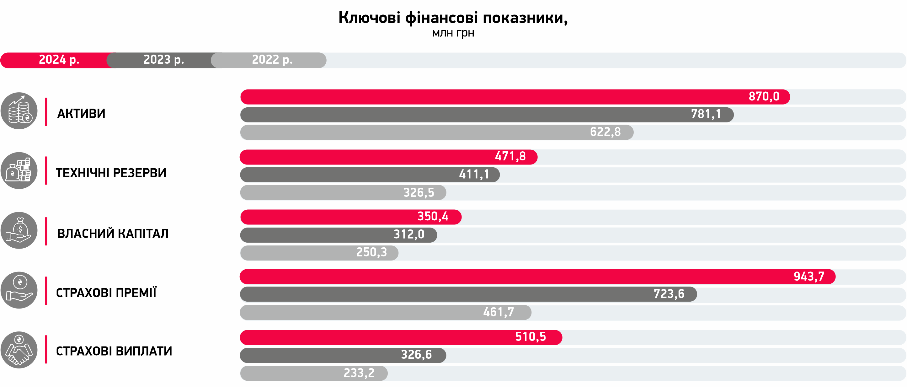 Власний капітал СК «Експрес Страхування» в січні-грудні 2024 року зріс на 38,4 млн грн (+12%), до рівня 350,4 млн грн, а технічні резерви – на 60,7 млн грн (+15%), до 471,8 млн грн. Таке зростання капіталу і резервів підтверджує стратегічну спрямованість Компанії на довгострокову фінансову стабільність та захист інтересів клієнтів.