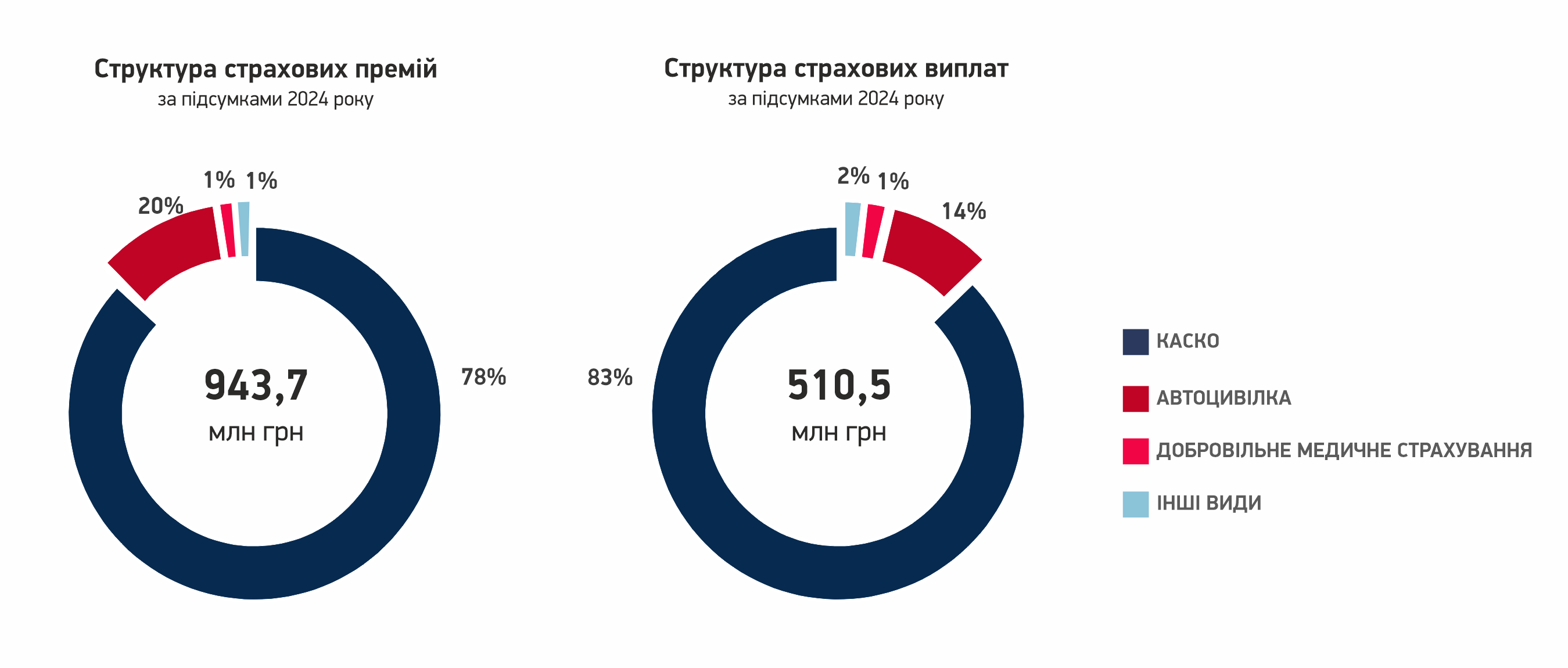 У тому числі, страхові відшкодування клієнтам за договорами КАСКО у 2024 році становили 426,7 млн грн, що на 47,9% перевищує відповідний показник 2023 року, виплати потерпілим з ОСЦПВ склали 73,0 млн грн (+132,2%), виплати з інших видів страхування – 12,9 млн грн (+15,8%).